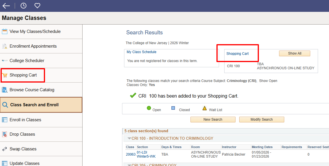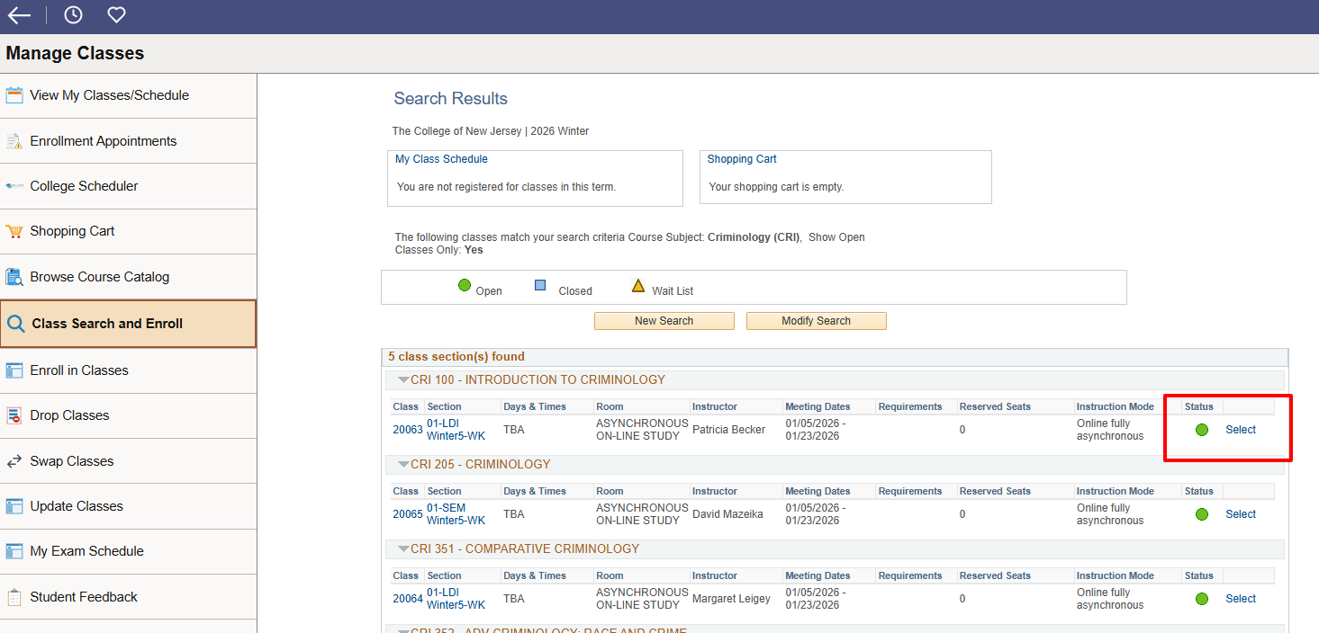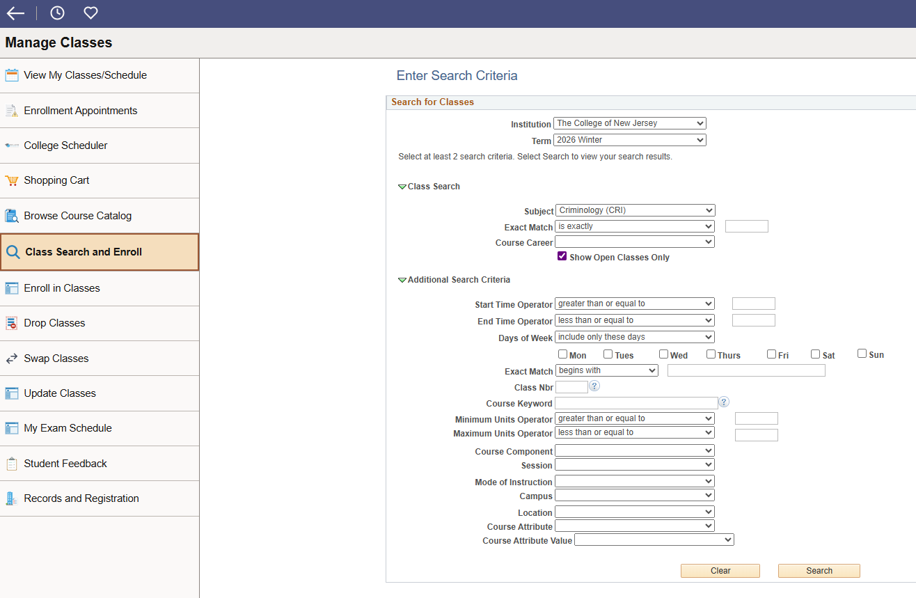 Select “Class Search and Enroll” from the menu on the left. Enter your search criteria.