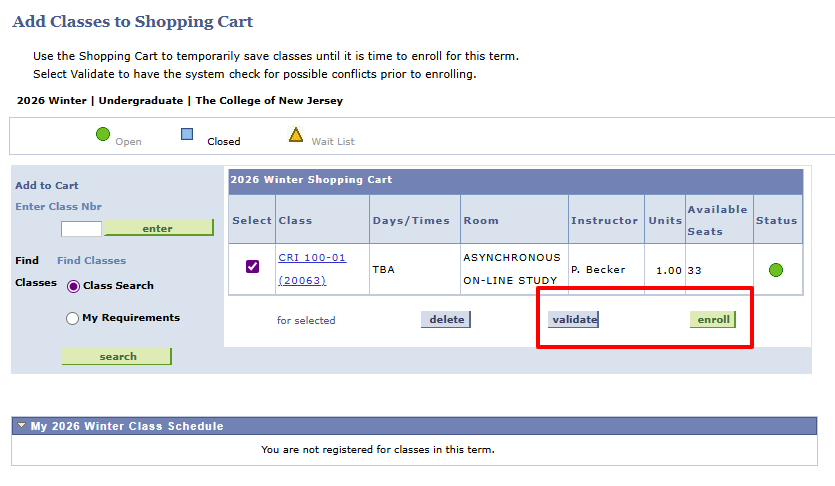 Select the class you are enrolling in. You may either select “validate” to ensure you meet the class requirements or select “enroll” to continue the enrollment transaction.